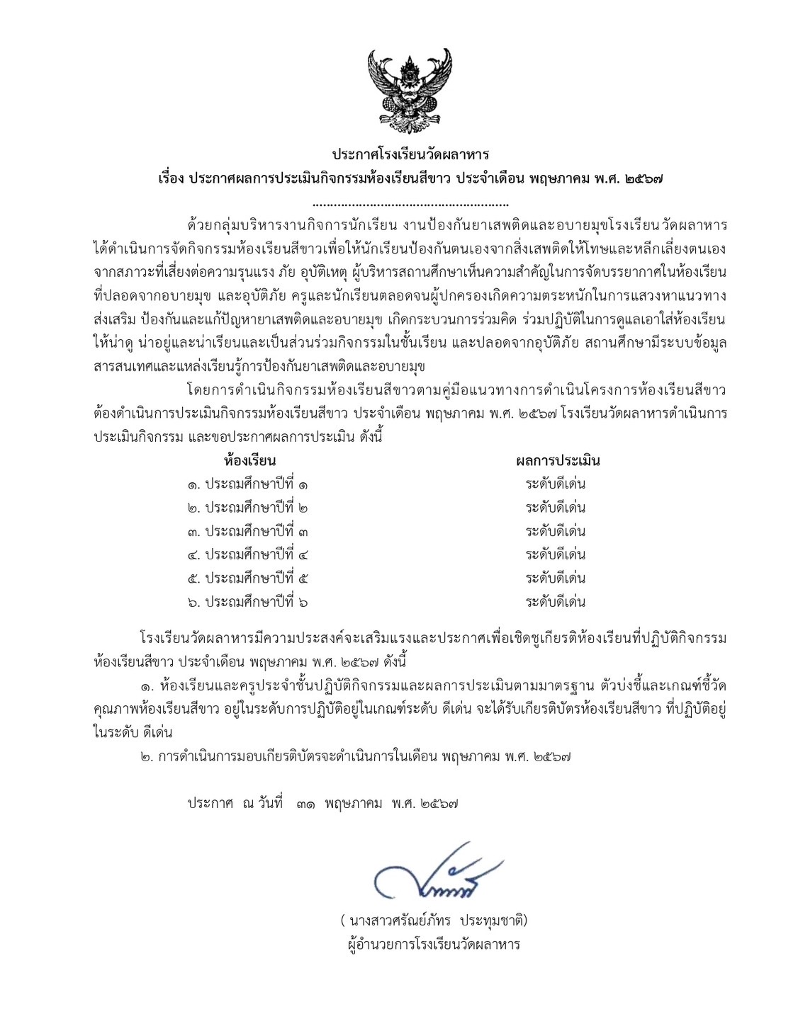 ผลการประเมินกิจกรรมห้องเรียนสีขาว ประจำเดือน พฤษภาคม พ.ศ. 2567
