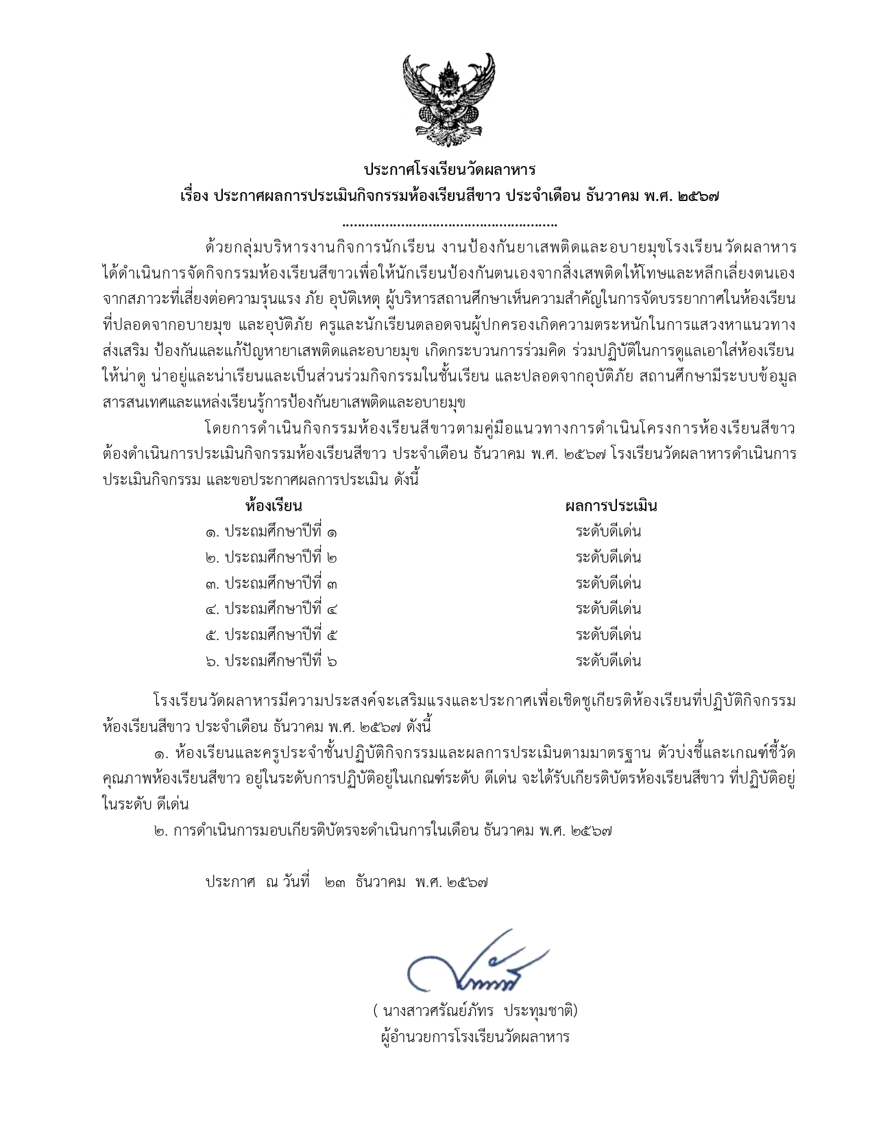 ผลการประเมินกิจกรรมห้องเรียนสีขาว ประจำเดือน ธันวาคม พ.ศ. 2567