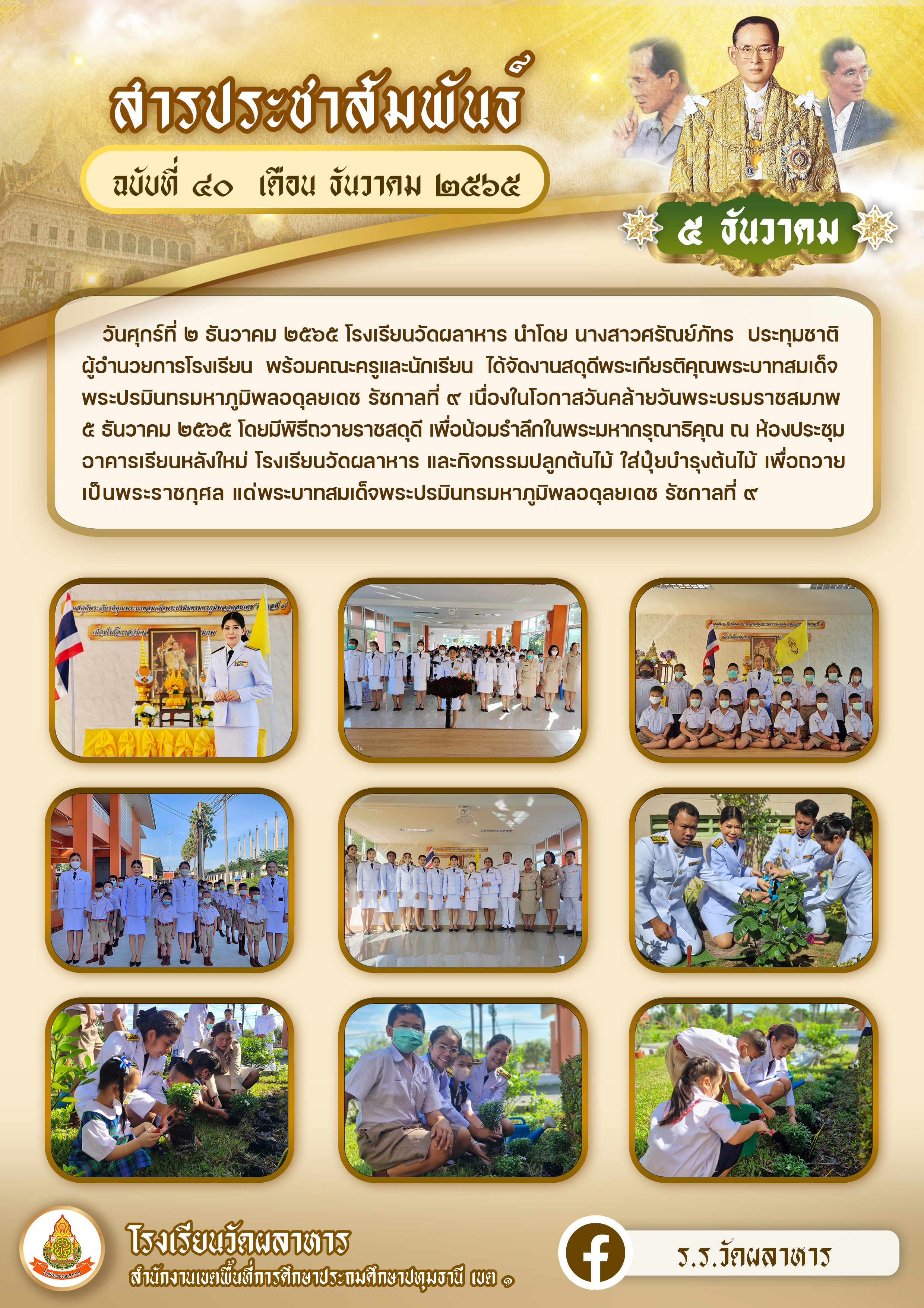 วันศุกร์ที่ ๒ ธันวาคม ๒๕๖๕ โรงเรียนวัดผลาหาร นำโดย นางสาวศรัณย์ภัทร ประทุมชาติ ผู้อำนวยการโรงเรียน พร้อมคณะครูและนักเรียน ได้จัดงานสดุดีพระเกียรติคุณพระบาทสมเด็จพระปรมินทรมหาภูมิพลอดุลยเดช รัชกาลที่ ๙ เนื่องในโอกาสวันคล้ายวันพระบรมราชสมภพ ๕ ธันวาคม ๒๕๖๕ โดยมีพิธีถวายราชสดุดี เพื่อน้อมรำลึกในพระมหากรุณาธิคุณ ณ ห้องประชุมอาคารเรียนหลังใหม่ โรงเรียนวัดผลาหาร และกิจกรรมปลูกต้นไม้ ใส่ปุ๋ยบำรุงต้นไม้ เพื่อถวายเป็นพระราชกุศล แด่พระบาทสมเด็จพระปรมินทรมหาภูมิพลอดุลยเดช รัชกาลที่ ๙
